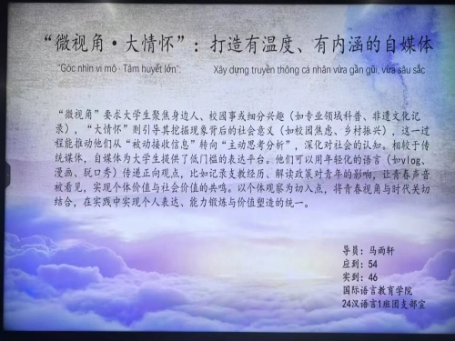 传递青春正能量并非空洞说教,而是需要大学生主动挖掘身边的鲜活案例。24汉语言2班的同学在演讲《以媒传情,青春向上》中就挖掘了身边的鲜活案例,比如记录校园志愿者的服务日常、分享学长学姐的奋斗故事、解读与青年相关的政策利好。促使同学们更深入地理解“正能量”的内涵,将爱国、奋斗、担当等抽象价值观,转化为自身认可并践行的行为准则。