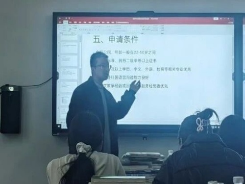 近日,河北外国语学院国际语言教育学院外事负责人刘爽老师在11号教学楼515教室举办了国际中文志愿者项目宣讲会。本次活动由学院外事部组织,面向各年级有意向参加的本科学生。