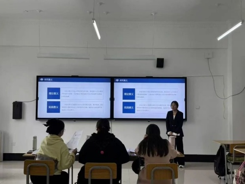 本次答辩选题侧重实际应用,答辩中以PPT展示结合语言讲解进行答辩。答辩中多以实习经历期间对当地教学的实际经验为研究内容,如:对初一历史核心素养下的书面作业现状研究调查。围绕选题的理论实际意义、国内外研究现状、研究问题、研究方法、解决方法等主要部分进行答辩。