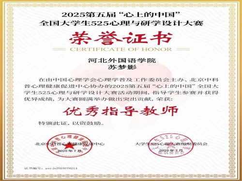 在人才培养工作中,苏梦影老师充分发挥专业优势,对学生进行针对性指导,助力学生在全国大学生525心理与研学设计大赛中斩获优异成绩。获奖学生表示,老师的悉心指导为其取得佳绩奠定了坚实基础。
