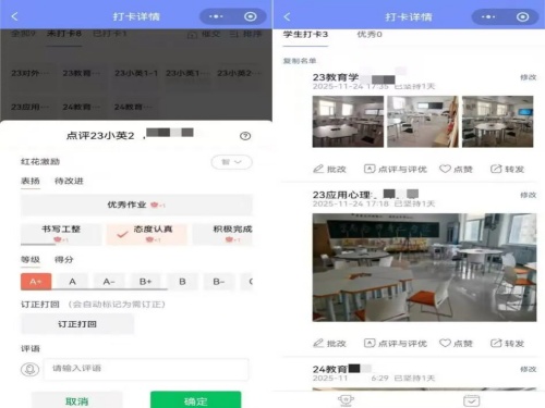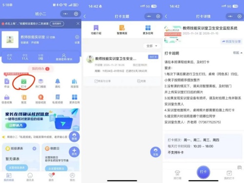 传统管理中,学生多被动接受检查,参与感薄弱。新小程序创新搭建“负责人统筹+学生参与”双向机制,让学生从“旁观者”变为“参与者”。学生课后需通过小程序打卡,上传实训室地面、桌椅清洁照片及设备状态影像;负责人则通过后台创建任务、审核打卡材料、发送催办提醒,实时反馈整改意见。